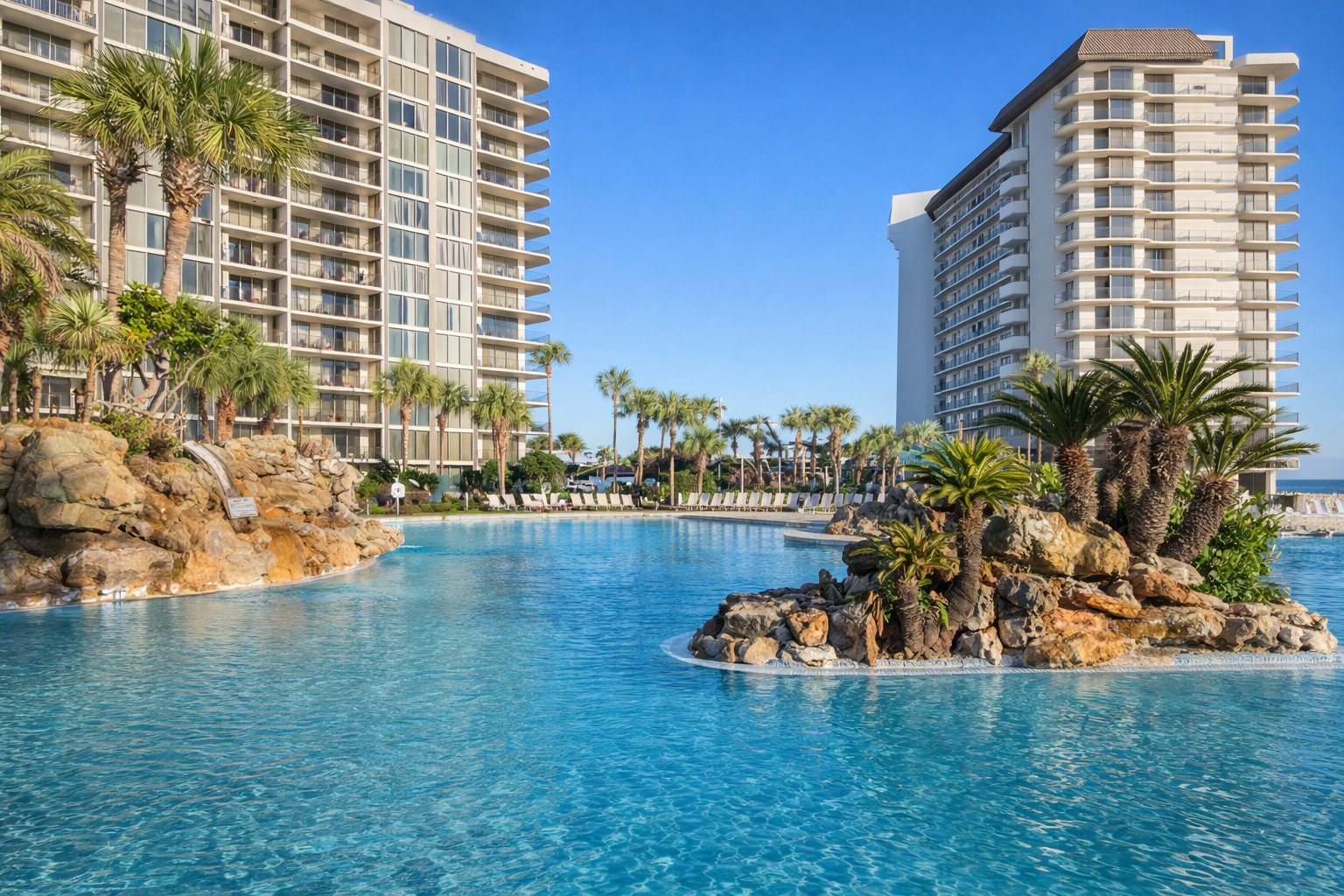There is no place in Panama City Beach that rivals Edgewater Beach and Golf Resort, offering more amenities than any other area resort: enjoy the seasonally-heated pool, hot tub, and sundeck directly in front of Tower 3 (the only things separating you from the beach and the water) or step a few paces to the right and dip into the beachfront lagoon pool that is 11,500 square feet and surrounded by lush tropical foliage and waterfalls. There are plenty of pool loungers for relaxing by the pool or you can rent a set of VIP Lounge Chairs/Umbrella or a poolside Cabana with luxury amenities. The free kids splash pad and two additional hot tubs flank the lagoon pool, and for meals/snacks/drinks, stop into Oceans Restaurant or pop by Blenders or Shakers bar.